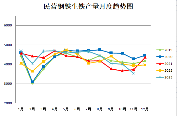 民營(yíng)鋼鐵生鐵產(chǎn)量月度趨勢(shì)圖